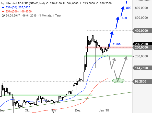 If it comes to a breakout above $ 265, the chances of a resumption of the parent rally are good. Next to the high at 420, the next price targets are in the range of $ 600 and $ 800. Later, four-digit courses would be conceivable.
