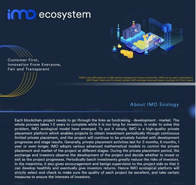 The IMO Ecosystem project has developed a high-quality, high-quality private placement platform ecological model that enhances the Blockchain project to easily raise funds by obtaining periodic investments through sustainable limited private placement.