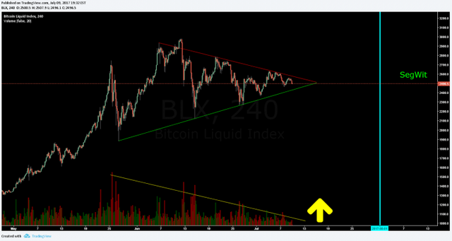 Bitcoin has essentially remained flat for the week, and it is no coincidence that price action has slowed as a protocol altering event, UASF/BIP148 approaches. The spot price appears stuck in heavy triangular consolidation. Traders will note the descending volume profile, and expect a heavy spike in volume upon resolution of the consolidation.