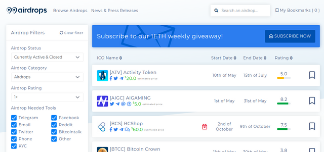 Just like the 99airdrops.com, this platform is also well designed and arranged. The airdrops featured on the site can be filtered based on current or ongoing events to those ending soon.