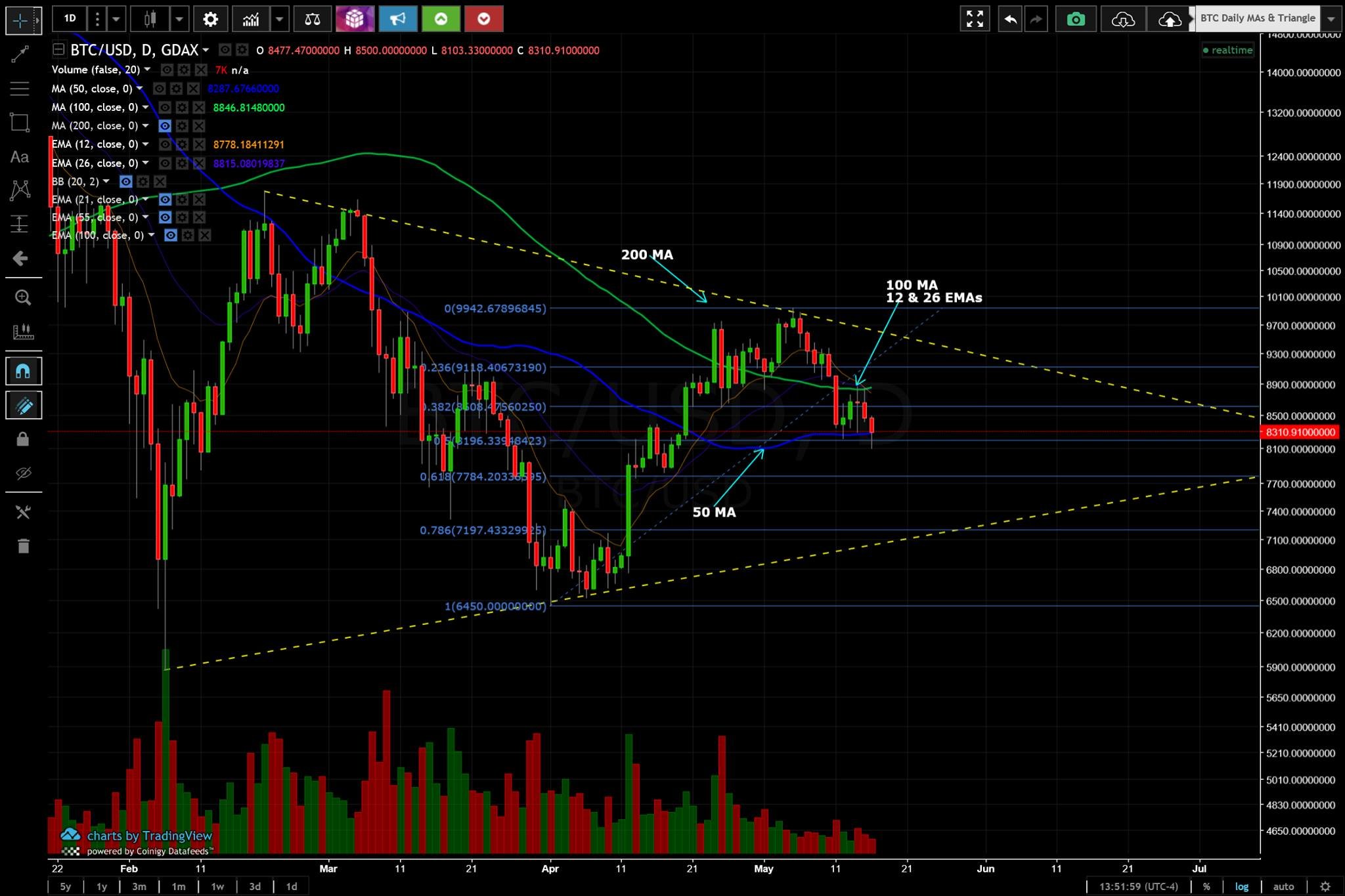 So what happens if $7800-8200 range does not hold? Then I will look to next likely support area which to me is down at $7200. This lines up with our .786 Fib line as well as the bottom of a large triangle we are in.