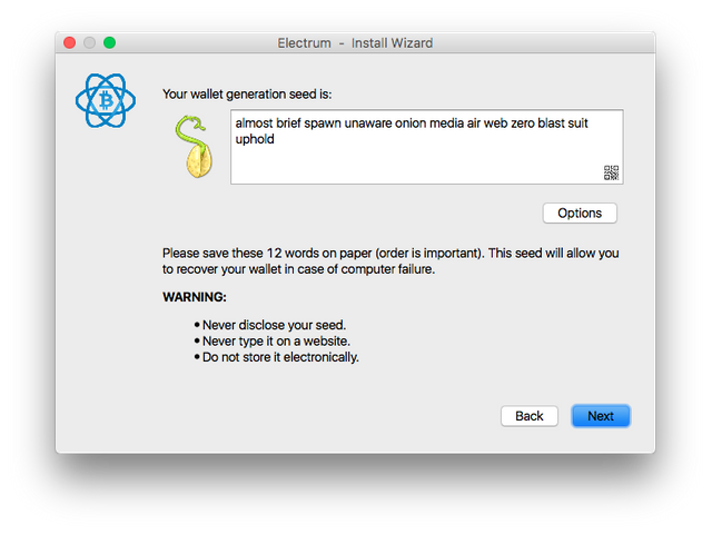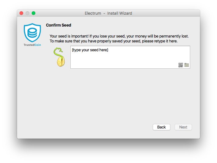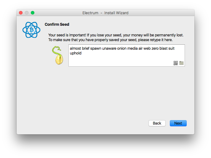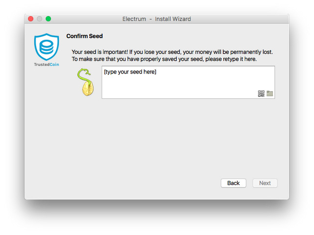 Step 7. Now, Electrum will ask you what your seed was, to make sure you copied it down and kept it safe. Type your seed in and press "next." If you forgot to copy it down, press "Back" so Electrum can regenerate your seed.