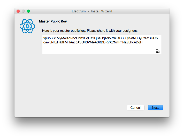 Step 4c. Now, Electrum will show you your master public key. If the other keys are to be held by you, you can store it in a safe place; otherwise, you'll need to give it to the other key holders or cosigners.