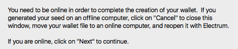 Step 9. The next screen will ask you if you are on a computer connected to the Internet. If you are, press "Next"; if not, move your wallet file (the path should be shown on the screen) to an online computer and reopen it with Electrum.