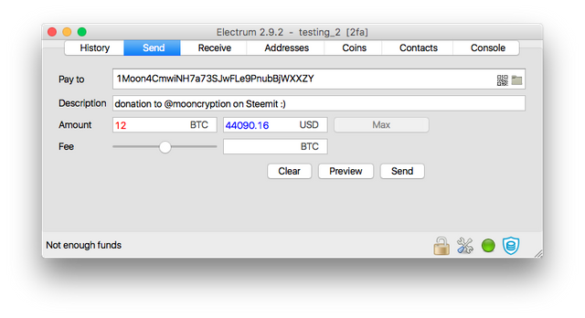 When you want to send, press the "Send" button. Electrum will ask you for a 2FA code from Google Authenticator on your phone; type it in. After that, hit "enter" and your payment will go through!