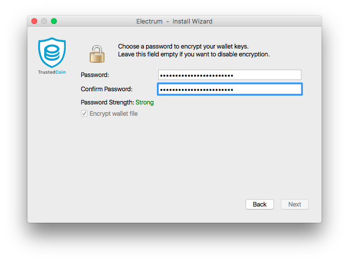 Step 8. Now you'll need to choose a password to encrypt your wallet. Enter a strong yet memorable password into the boxes to encrypt it. If you really don't want to encrypt your wallet, you can leave both boxes blank, but it's highly recommended to do so for security reasons.