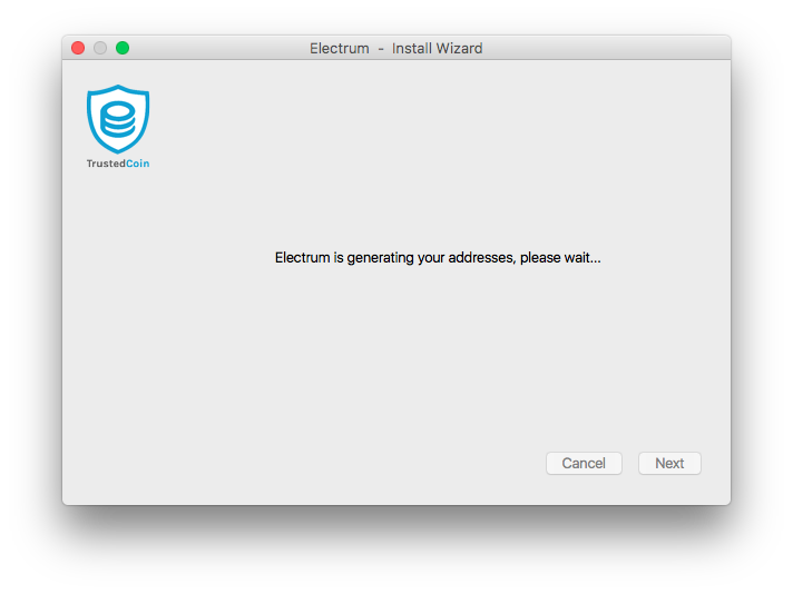 Step 12. Electrum will now generate your addresses. This may take a few minutes, but shouldn't be that long (it took about 30 seconds on my testing computer).