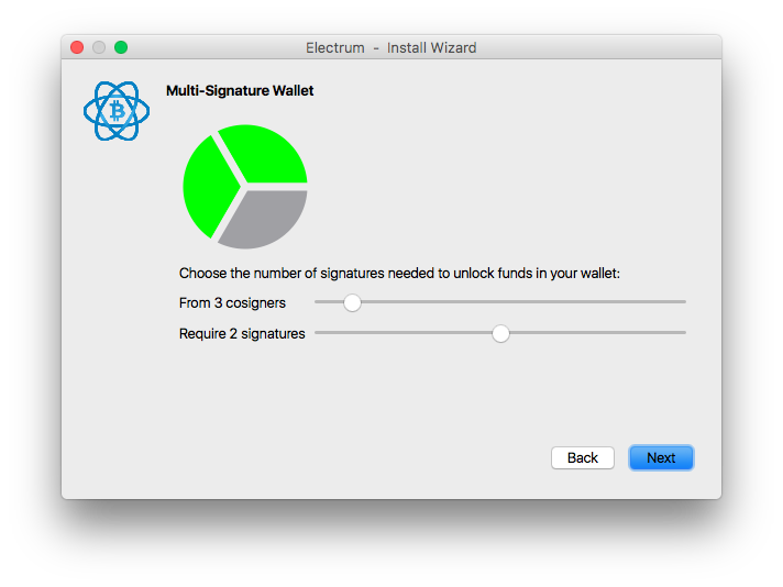 Step 3. On the next screen, you'll choose the number of keys the wallet has, and the number of keys needed to initiate a transaction. For example, a 2 of 3 wallet (shown below) has 3 total keys (divided between, say, a man, his brother, and his wife) but only requires 2 keys to start a transaction or move coins.