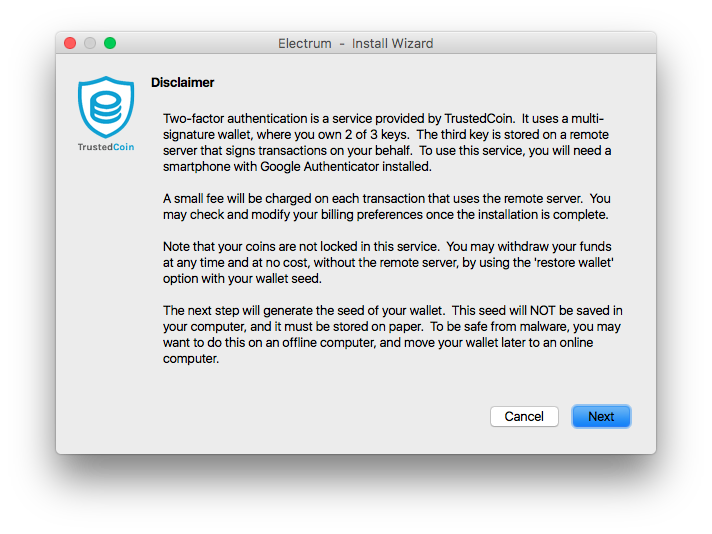 - Two-factor authentication relies on a service called TrustedCoin, however, at no time can TrustedCoin access your coins.