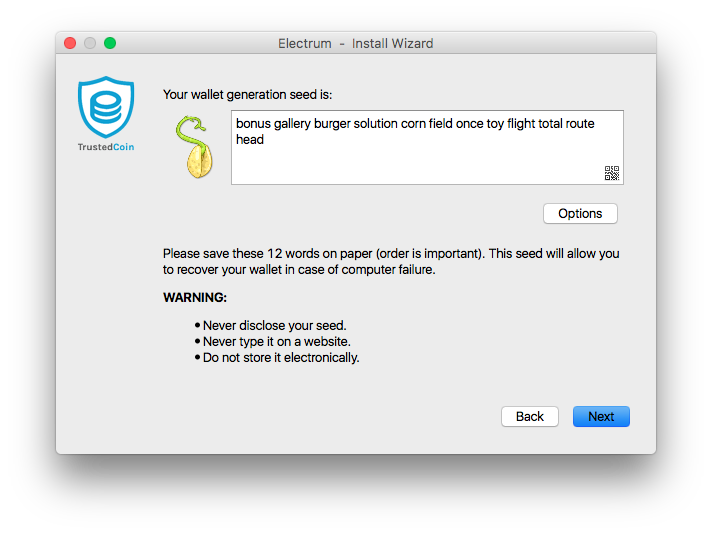 Step 6. After pressing "next," you'll see your wallet seed. It's incredibly important that you copy this seed down on paper (not on a computer) and store it very safely. Even if the two-factor authentication service (TrustedCoin) disappears or your phone gets stolen, you can always use this seed to restore your full wallet and access your bitcoins. It's like a recovery passphrase, so you need to keep it very safe.
