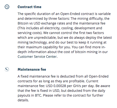 The current maintenance fee is around $0.00028 daily per GH/s you buy. For example, if you buy their $30 200GH/s contract, you can expect to pay about six cents daily for maintenance, however the payouts generally will greatly exceed this fee. Remember that if the payouts start to go under the fee, the mining will be terminated, but unless that happens it's lifetime mining!