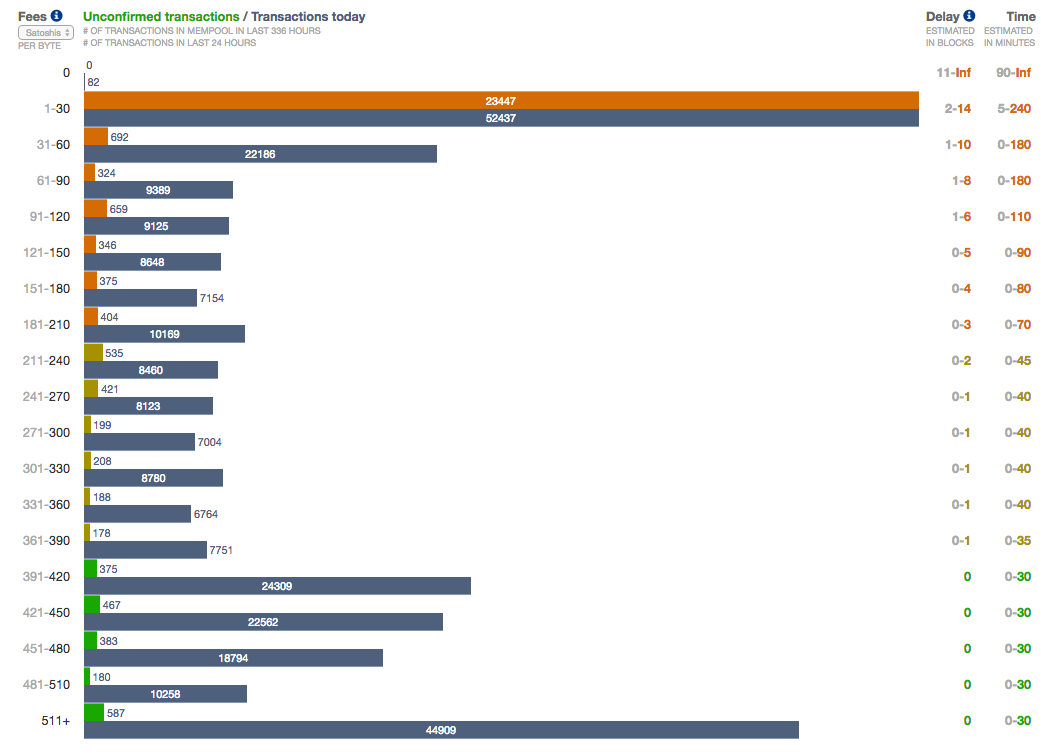 We can see from the "before" shot that a fee of 221-240 could result in an up to 28-block or 7 hour wait. A fee of 60 sat/byte could result in waiting indefinitely or waiting for over a day. A fee of 300 sat/byte could get confirmation in the next five blocks or in the next hour— for the average transaction size, this is almost 0.0007 BTC of transaction fees—but these aren't even the highest fees that were necessary during that period.