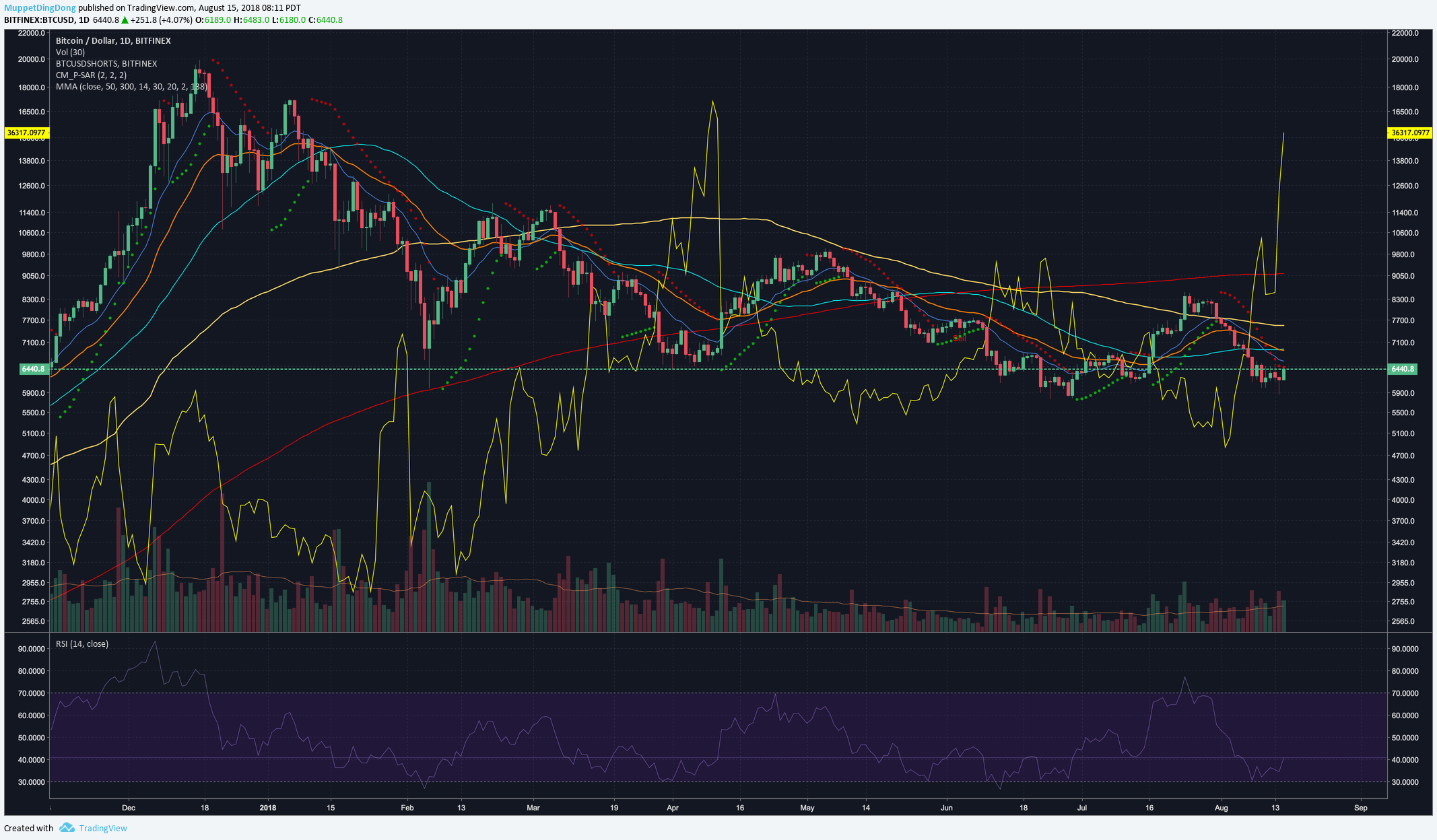 (Bright Yellow Line) BTC Shorts are currently at an all time weekly high. This is intraweek, but notable since if those people get liquidated, look what happened in April...