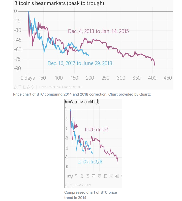 Quartz revealed a chart comparing the mid-term price trend of bitcoin in 2014 and 2018, and based on the movement of bitcoin from December of 2017 to June of this year, the correction bitcoin is currently enduring could be substantially shorter than its correction in 2014.