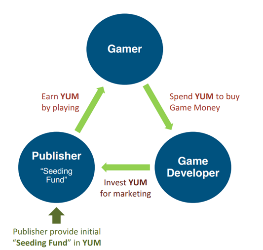 Каждый разработчик, запускающий собственный продукт на платформе, создает специализированный фонд, который наполняется монетами YUM. Средства из данного фонда будут расходоваться на поощрение игроков. Таким образом, разработчики игрового контента привлекают новую аудиторию с минимальными затратами ресурсов, так как, рекламируя свой продукт, они напрямую обращаются к целевой аудитории. За счет привлечения новых игроков разработчики игр увеличивают собственный доход. Также это дает шансы развиться начинающим компаниям, которые никому не известны.
