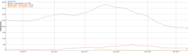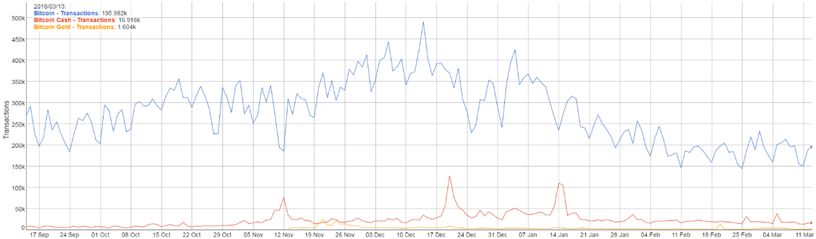 After initial sell-offs from traders and investors who were not prepared to speculate on the potential value of Bitcoin Cash and Bitcoin Gold, both cryptocurrencies have managed to grow substantially in market value as mentioned prior. Blockchain network usage is one characteristic that can be used as a basis to attempt to rationalise the financial value of cryptoassets. Looking at the last six months of the top 3 Bitcoin cryptocurrencies (a timeframe long enough where all their blockchains have been simultaneously active), Bitcoin Cash and Bitcoin Gold do not come close to the amount of transactions Bitcoin processes.