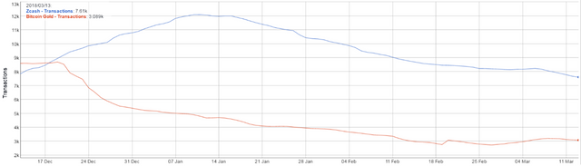Figure 12 30-day moving average of number of transactions processed by Zcash and Bitcoin Gold.