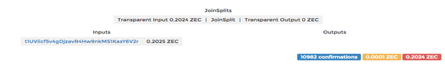 Figure 2 Transaction between two shielded addresses where the transaction fee is visible.