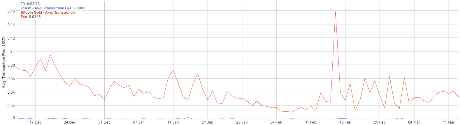 Figure 11 Zcash v Bitcoin Gold average transaction fee.