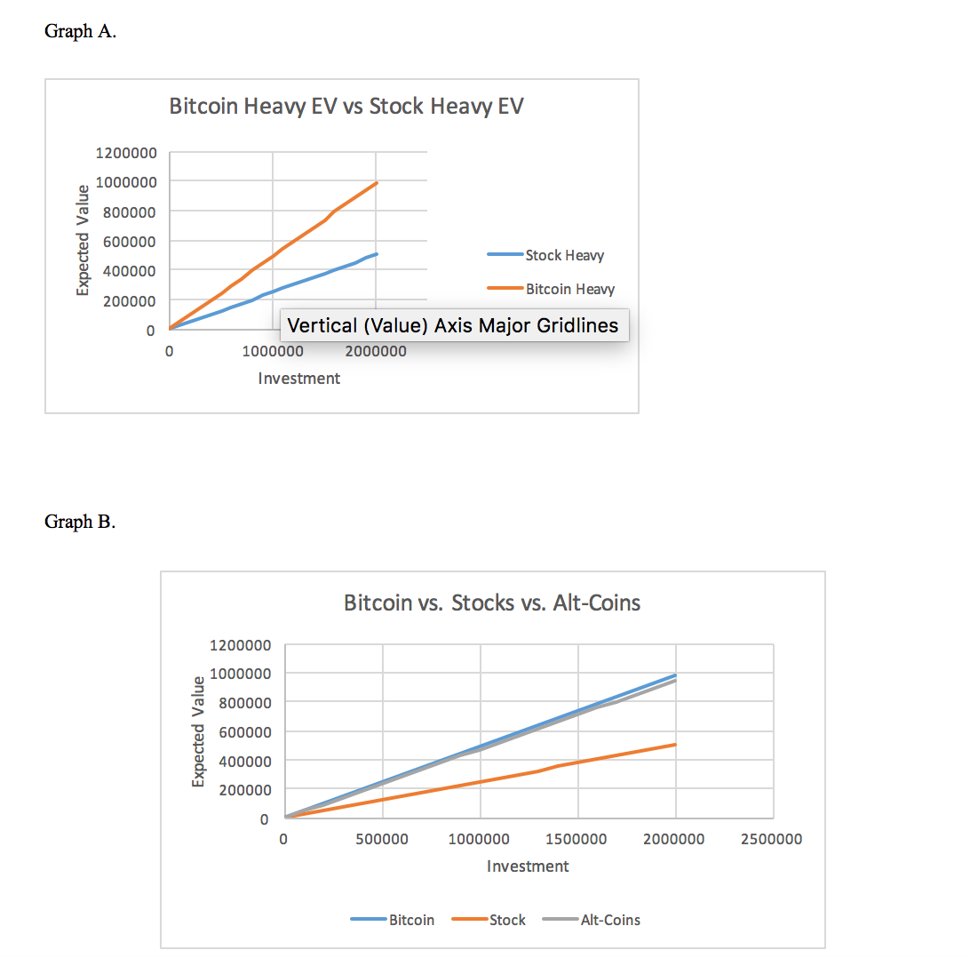 Both portfolios have a lump sum of a million dollars for simplicity. This allows us to make the larger portion of each portfolio $700,000 and the smaller portion $300,000. I then took these numbers and plugged them into the expected value formulas (Appendix A,B). The expected value for the Bitcoin heavy portfolio came out to be $493,148.30 and the expected value for a Stock heavy portfolio came out to be $251,235. The state variable here would be around 49% EV for Bitcoin heavy and around 25% for stock heavy. Any investor looking at the game would see this and know to choose a Bitcoin heavy portfolio for greater returns. So the answer to which portfolio would be more profitable is Bitcoin assuming that the investors are risk neutral. Because they are risk neutral they choose the option with the highest expected value. Obviously this is only one model but when adjusting the weights and probabilities, it can be observed that it would take a substantially larger chance of a major pullback occurring for a Bitcoin heavy portfolio to be the least valuable option. Another observation can be made by changing the return for the stock portion of the portfolio. Even if the market continues to grow at its current rate of 13% the heavy stock portfolio still has less expected value. Really the return of the market is not a huge factor even if it increases because of the high potential of Bitcoin. Because Bitcoins current state isn't as volatile as it used to be the reward appears to outweigh the risk in terms of expected value giving investors a green light to invest heavier in the cryptocurrency.