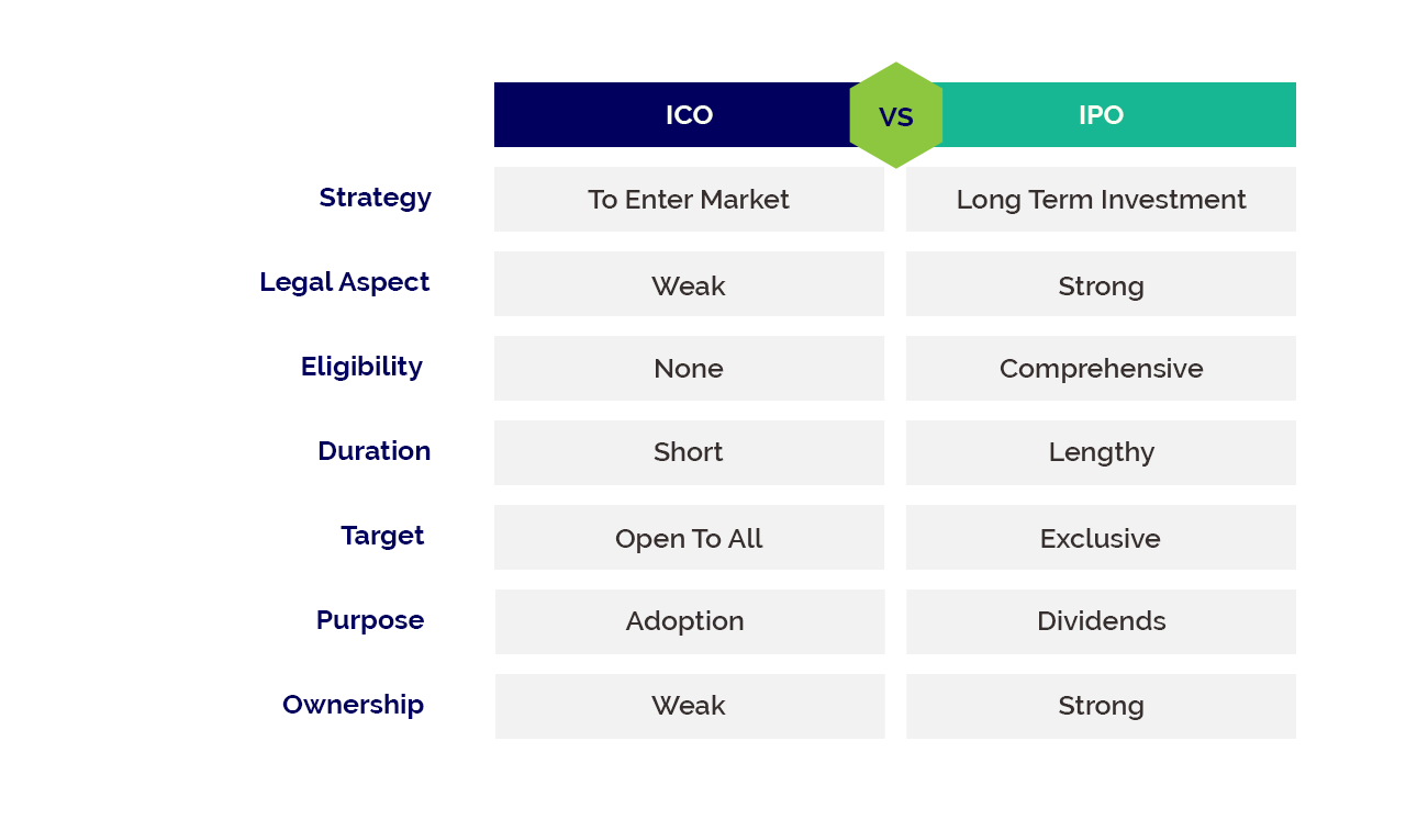 The strategy behind developing ICO is to raise funds for a project to enter the market. ICO is usually performed by start-ups. On the other side, IPO is performed at a bigger scale when a firm is finally stable and wants to expand with the help of the public.