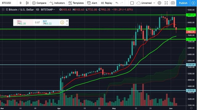Cryptocurrency is getting more and more attention. After huge and continuous uptrend since April, #Bitcoin has pull back on resistance line at 7.9k. Its #price may be in phase of correction for stable market. #share2steem