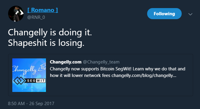 Changelly supports Segwit, Shapeshift lags behindpagoda (48)in #bitcoin • 8 years ago This is why competition is good, hopefully Shapeshift implements segwit soon. #cryptocurrency #ethereum #steem #news