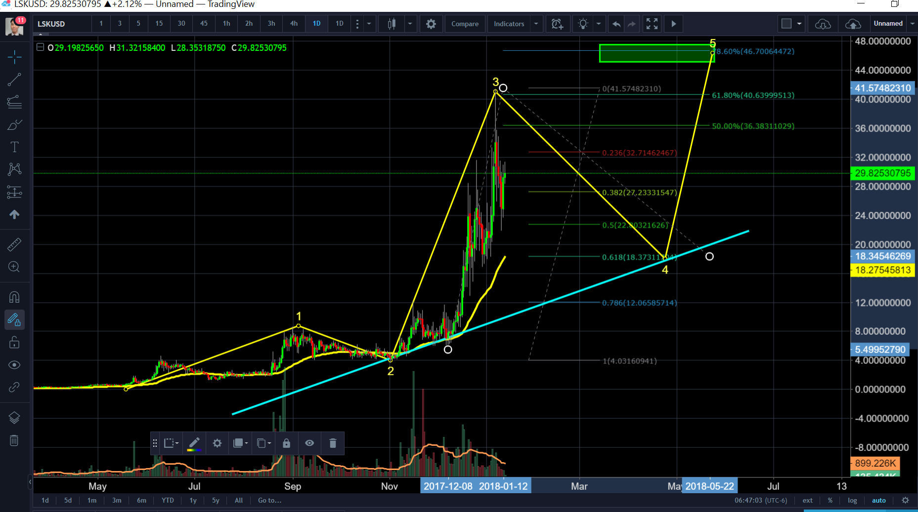 Lisk LSK Jan 13 Technical Analysis. Lisk quietly does 800%. What Next? Consolidation then $46.00