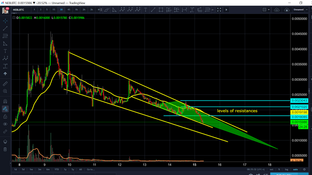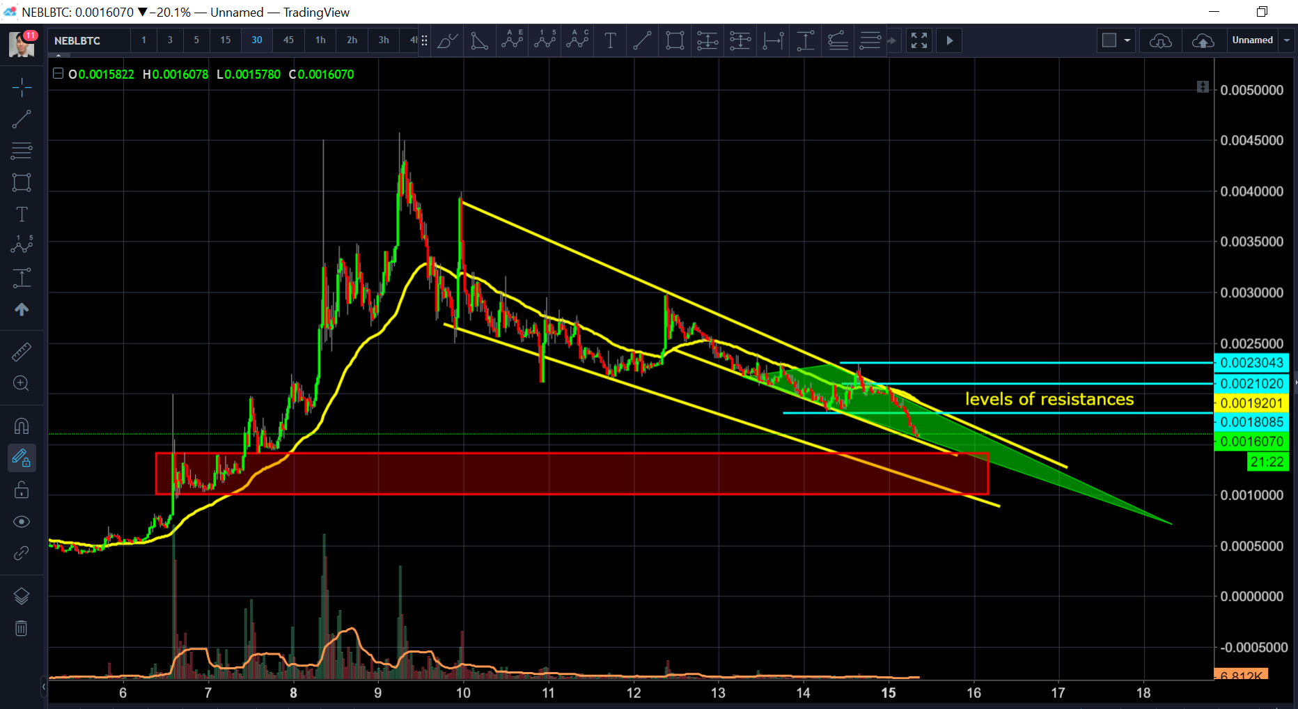 We see NEBL form 5 beautiful elliot waves up. Thus providing resistances that are now support with two different levels. Support zone one is currently being tested. If fail below near the 14.5K range, we may test lower range.