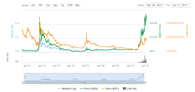 Litecoin as been surging since March, when it began climbing from $4.04 to $53.60 July 4. Litecoin crossed the $1 billion mark in market capitalization for the first time ever earlier this month.