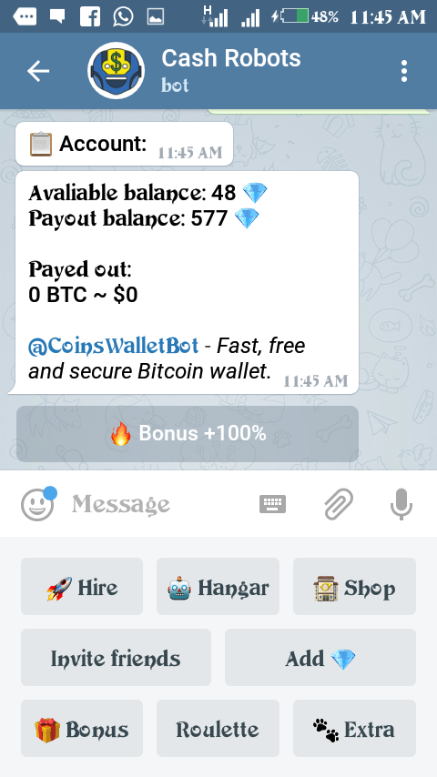Cash Robot is a bot that allows you to mine bitcoin in the form of diamonds. It is available on telegram and it's a game where you produce bitcoin! recommended to invest in this bot to have high profits,but if you won't invest no problem,you can gain with referrals in the sense that you can invite other people, friends and family by using your referral link which gives you 50 diamonds per referral or with the daily bonus! The start is very slow, you need to wait for daily bonuses to get to 1000 gems/diamonds. Then you can 'purchase' bots that will start collecting energy that you can convert in gems/diamonds.