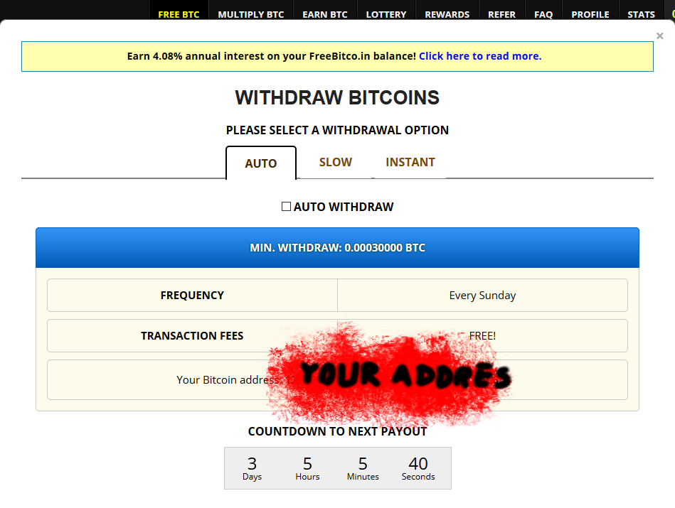 In first tab you can set auto withdraw. If you have this check button selected and you have balance of minimum 30'000 satoshi, you will receive payout to your address. There is also that notification about annual rate of 4.08% - if you have above 30'000 satoshi you will be receiving daily profit, however you have to turn off auto withdraw first!