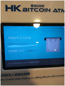 In the ATM center, you may see an ATM machine, and some Bitcoin collection.If you want to buy bitcoin, first you need a bitcoin wallet app. Rress ‘I Want Bitcoin’, then you scan your QR code on the window. The machine will show you the rate of trading HKD to mBTC, check it and insert cash on the machine.
