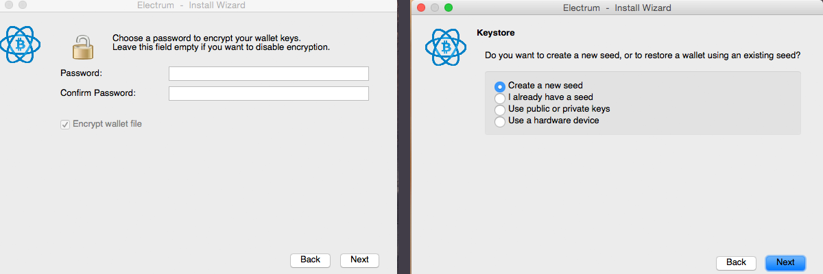 Create a strong password to encrypt the wallet, then choose “create a new seed.”