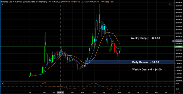 But even if Binance didn't have any token burns, their token price would still go up over time because they continue to make history and innovate. So where is price headed next, the chart suggests, price is heading to the weekly supply at $23.