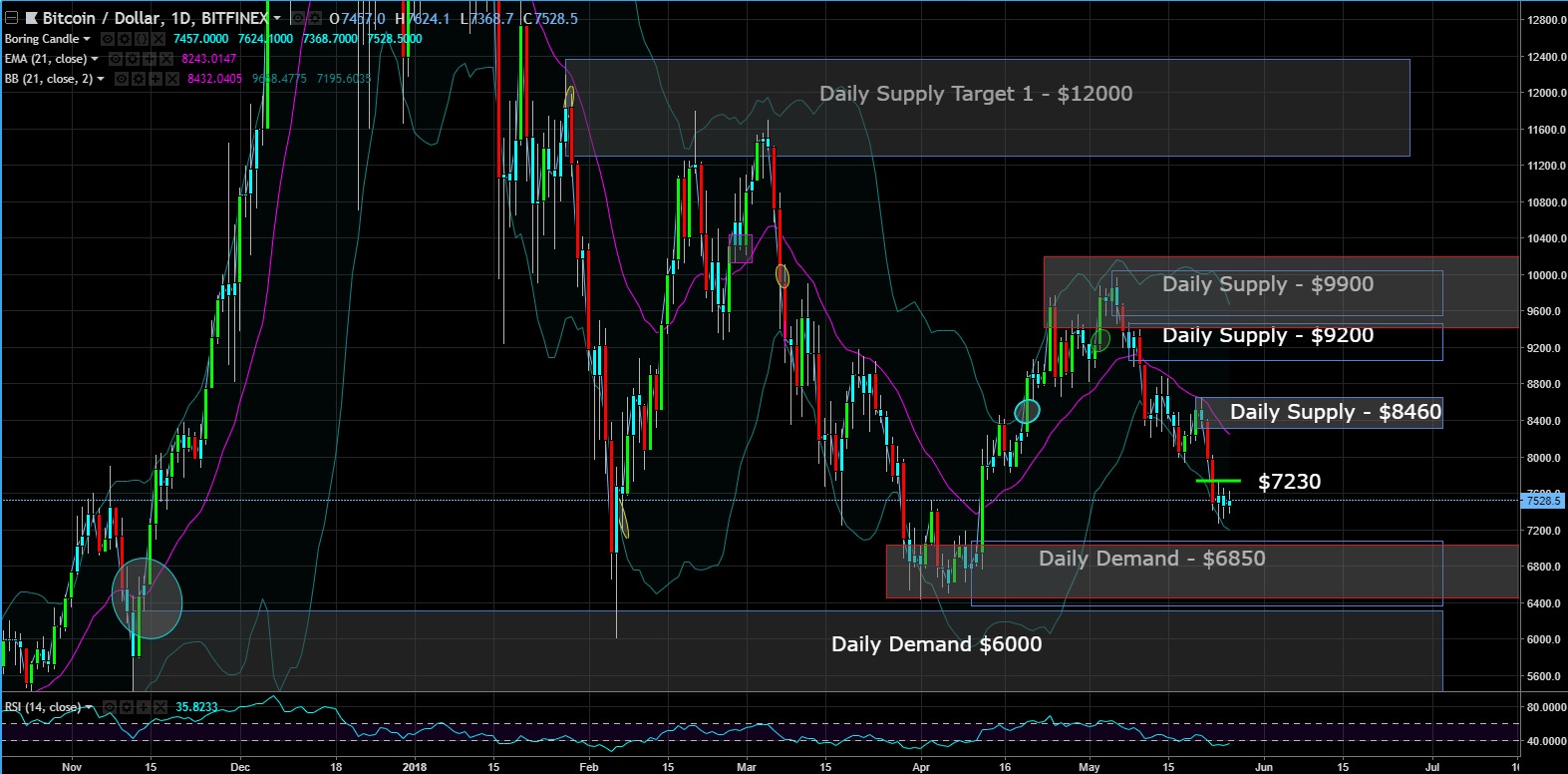 Price is currently sitting right smack in the middle of daily supply and daily demand. The trend is down currently. If you are considering going long, wait until price drifts down a bit lower to the daily demand level at $6850. This will allow you to optimize your risk to reward ratio.