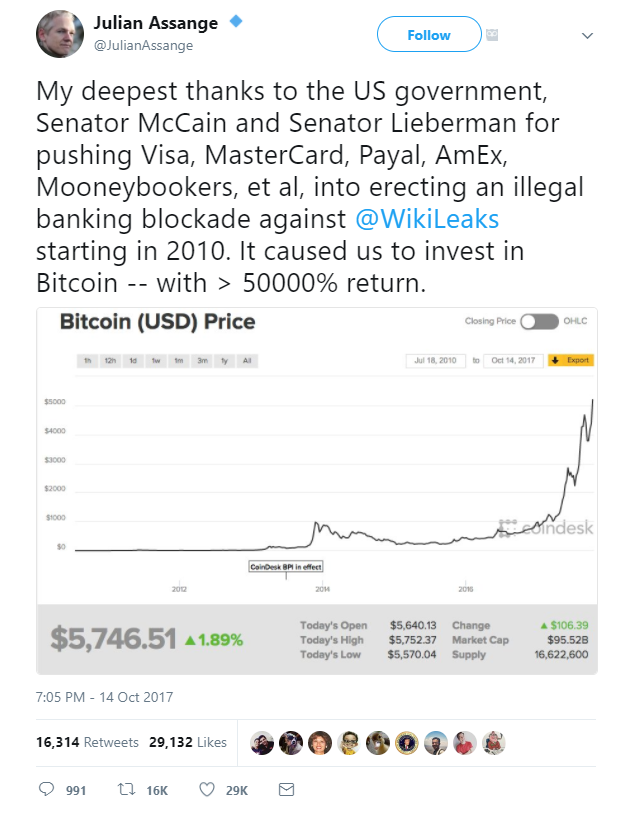Julian Assange, the man who took the world by storm with his Wikileaks expose, had claimed recently that he had made massive 50,000 % returns since he started investing in Bitcoins from 2011, when US government, banks, PayPal, and almost all financial institutions in the world locked his account and refused to transact with him.