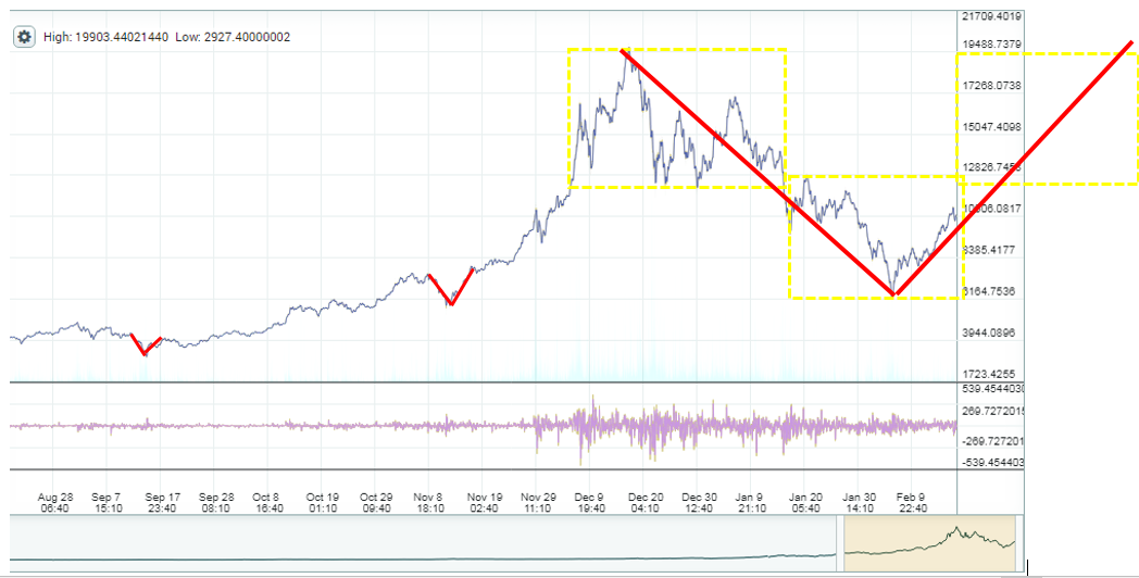 Bitcoin's bust-and-boom cycle follows the V-shaped pattern. This current correction is no different except that its the biggest by far. By mid-April, we could see bitcoin retesting the $20,000 psychological barrier - a very exciting time!