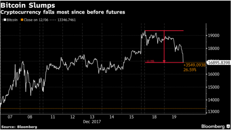 Bitcoin was trading at $16,626.42 at 10:25 a.m. in Hong Kong, down about 15 percent from a record high on Monday. That’s the steepest decline since before futures were introduced on Dec. 10.