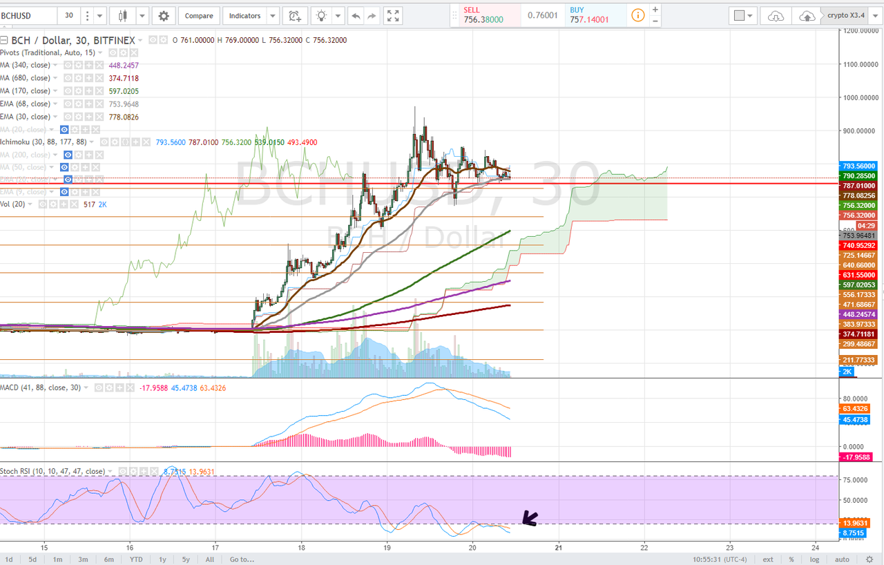 We are watching for a full 30 minute stochastic cycle on the 30 minute chart and how much damage or progress happens during. Note the Moving Average cross on the 30minute and the bearish twist in the ichimoku cloud.