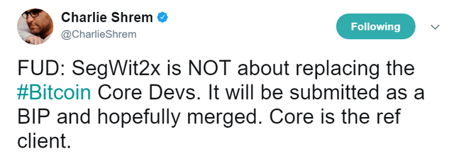 In fact, according to Charlie Shrem’s tweet above, the hope of Segwit2x is that the hard fork changes would simply be accepted into Bitcoin Core. Of course, some signers of the New York Agreement have explicitly stated they don’t want Core to control the reference client, so this is an open question.