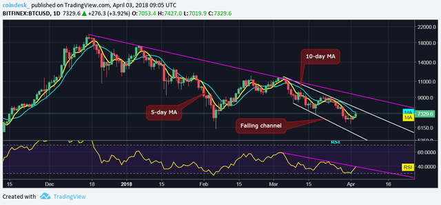 As of writing, bitcoin is changing hands at $7,400 on Bitfinex and the average price on leading exchanges, as represented by CoinDesk's Bitcoin Price Index, is seen at $7,380.