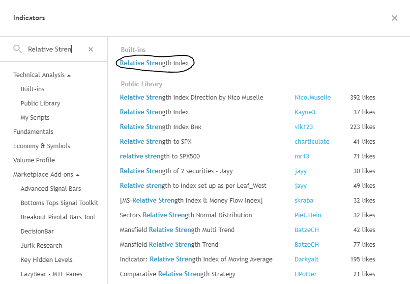 Next, search "Relative Strength Index" in the menu that pops up. Click on "Relative Strength Index" under Built-ins.