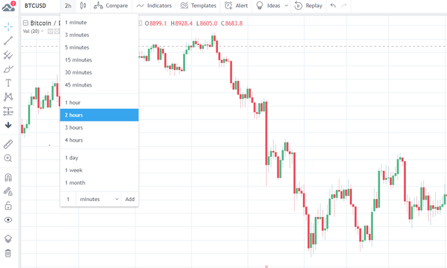 Now you should see a chart of Bitcoin price! First, go to the top left of the screen and change the dropdown next to the symbol to be 2 hours. This places your chart on a good scale, perfect for swing trading.