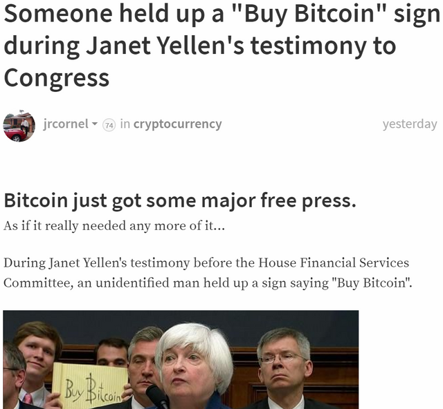 I first heard about this from @jrcornel post: https://steemit.com/cryptocurrency/@jrcornel/someone-held-up-a-buy-bitcoin-sign-during-janet-yellen-s-testimony-to-congress