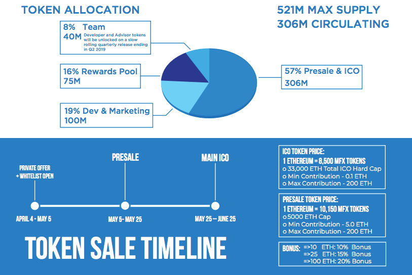 The total number of MFX tokens capped at 521,000,000. 1 Ether = 8,500 MFX tokens.
