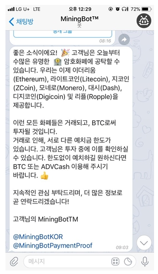 무슨 내용이냐면 위에 언급된 코인으로 투자를 해도 마이닝봇이 해당 거래를 비트코인으로 변경해 해당 금액만큼의