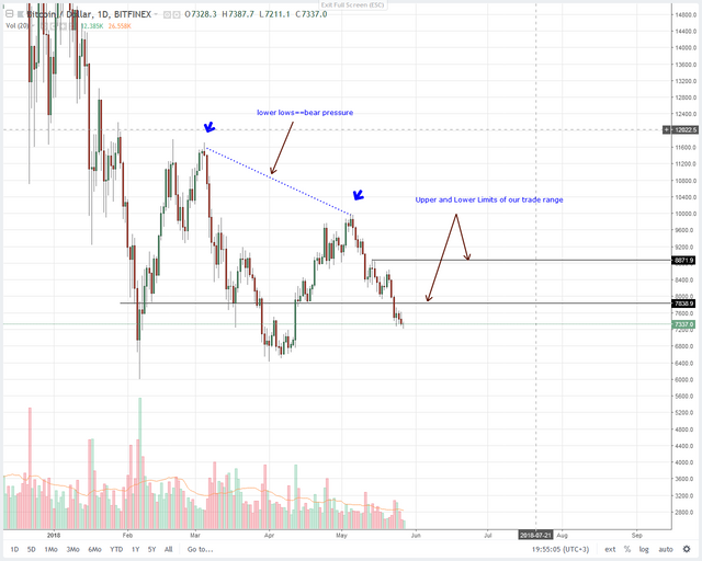 To get a perspective of possible trend, May 22 and 23 candlesticks should paint a better picture. During these two days, there was a literal doubling of trade volumes with prices sinking below $7,800. After that, the follow through has been fair in volumes but then prices are not recovering safe yesterday’s weak attempts of buy shore.