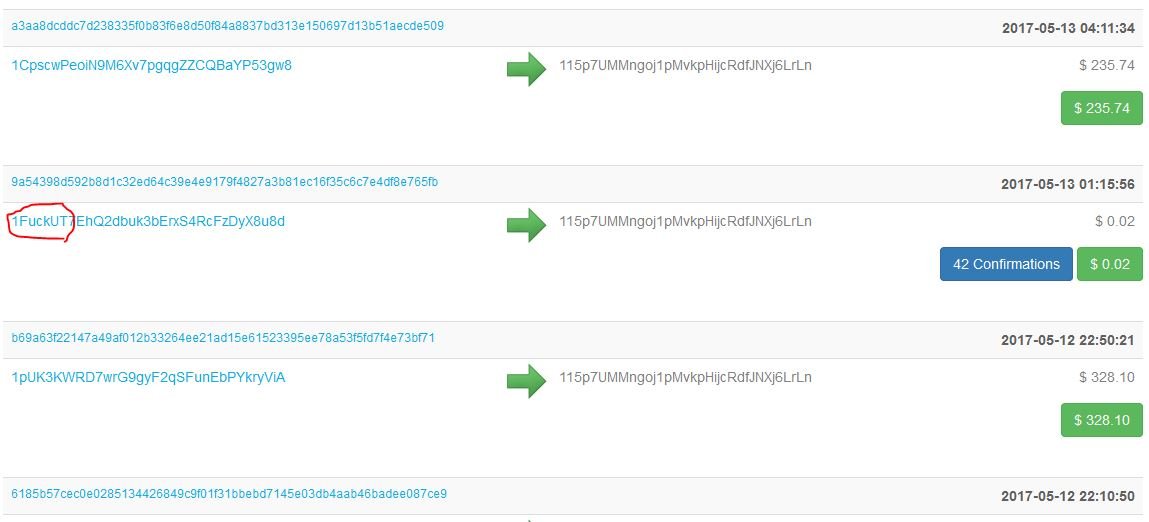 I found that a lot of people were using custom bitcoin wallet addresses to send small messages to the hackers. Here are some of them.