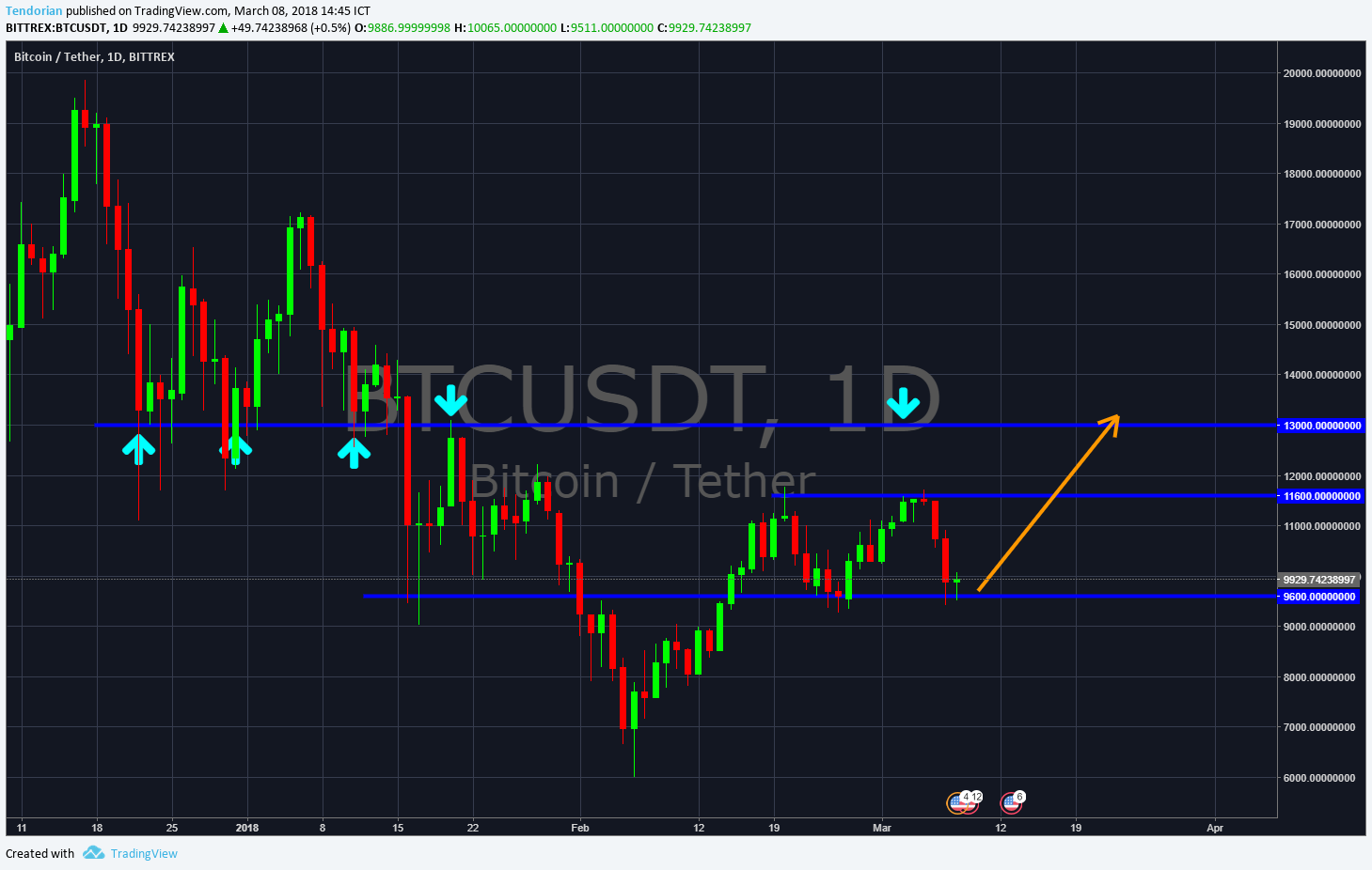 After the drop to under $10k yesterday, the support around $9600 looks to be holding rather well and price is bounding up from here. This could be a very good place to add to your bitcoin position. Short term target is around the $13000 area. Support and resistance lines can be seen in the chart and it is self explanatory.